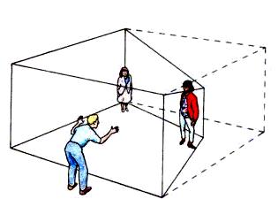 Нам кажется, что углы находятся на одинаковом расстоянии от нас, но это на самом деле не так. Левый видимый угол почти в два раза дальше правого. Если осмотреть комнату с другой стороны, то ощущение иллюзии исчезает и открываются все секреты комнаты.