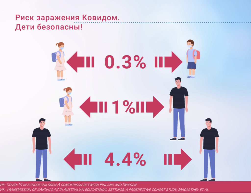 Были проведены исследования. Одно из них в Австралии с участием более 1 млн детей и 143 тыс. учителей из 7,7 тыс. детских садов и школ. Среди несовершеннолетних зафиксировано 97 случаев заражения и ни одного случая смерти. Из этого всего лишь 27 случаев произошли в школе.