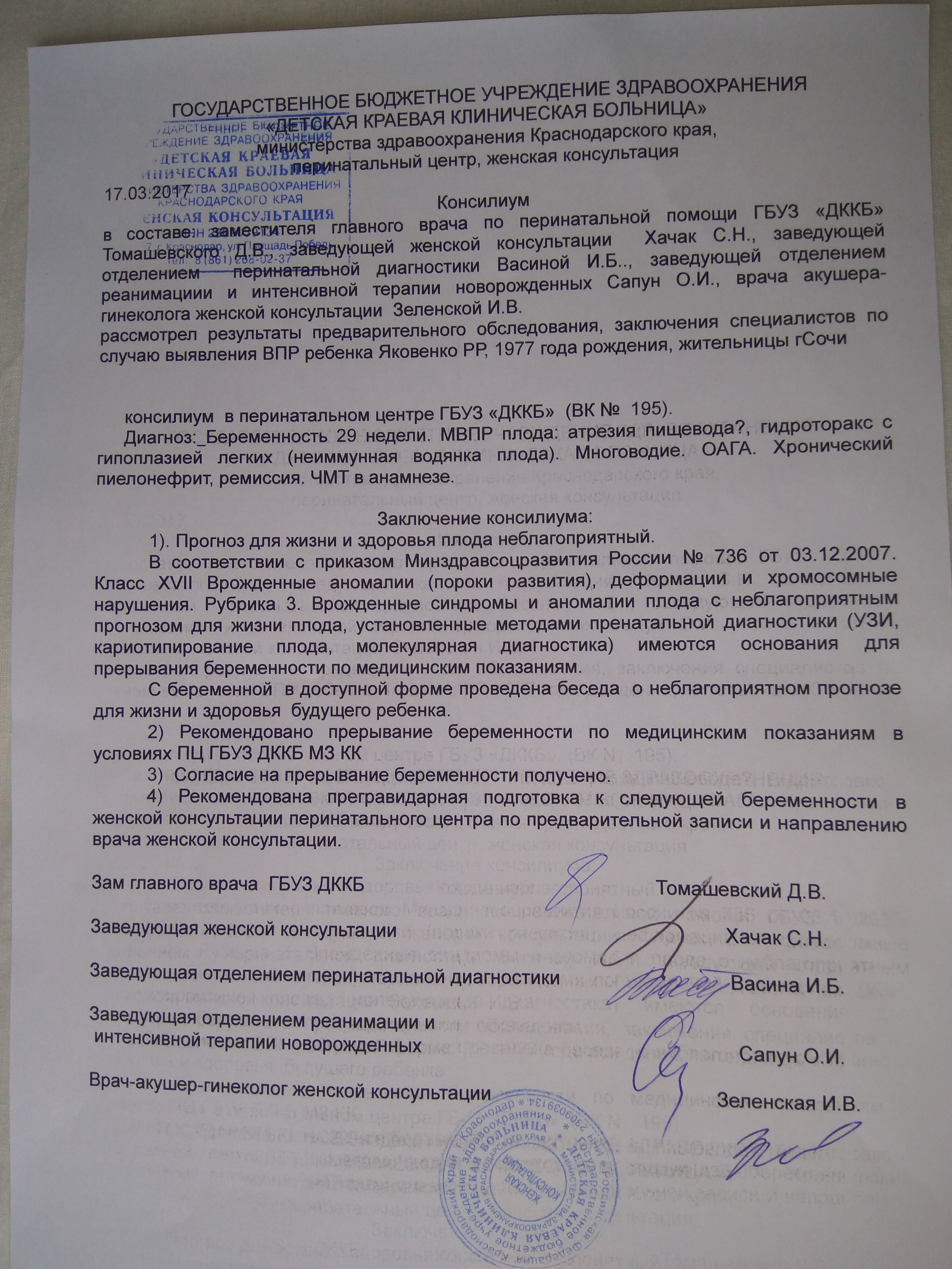 Здравствуйте! Мне рекомендовано прерывание беременности по медицинским показаниям. Заключение консилиума с диагнозом моей малышки я приложила. Очень надеюсь получить консультацию от Вас! В каждой Вашей передаче есть надежда на излечение того или иного заболевания! Помогите понять, как мне поступить! Неужели, нет никаких шансов спасти мою принцессу?