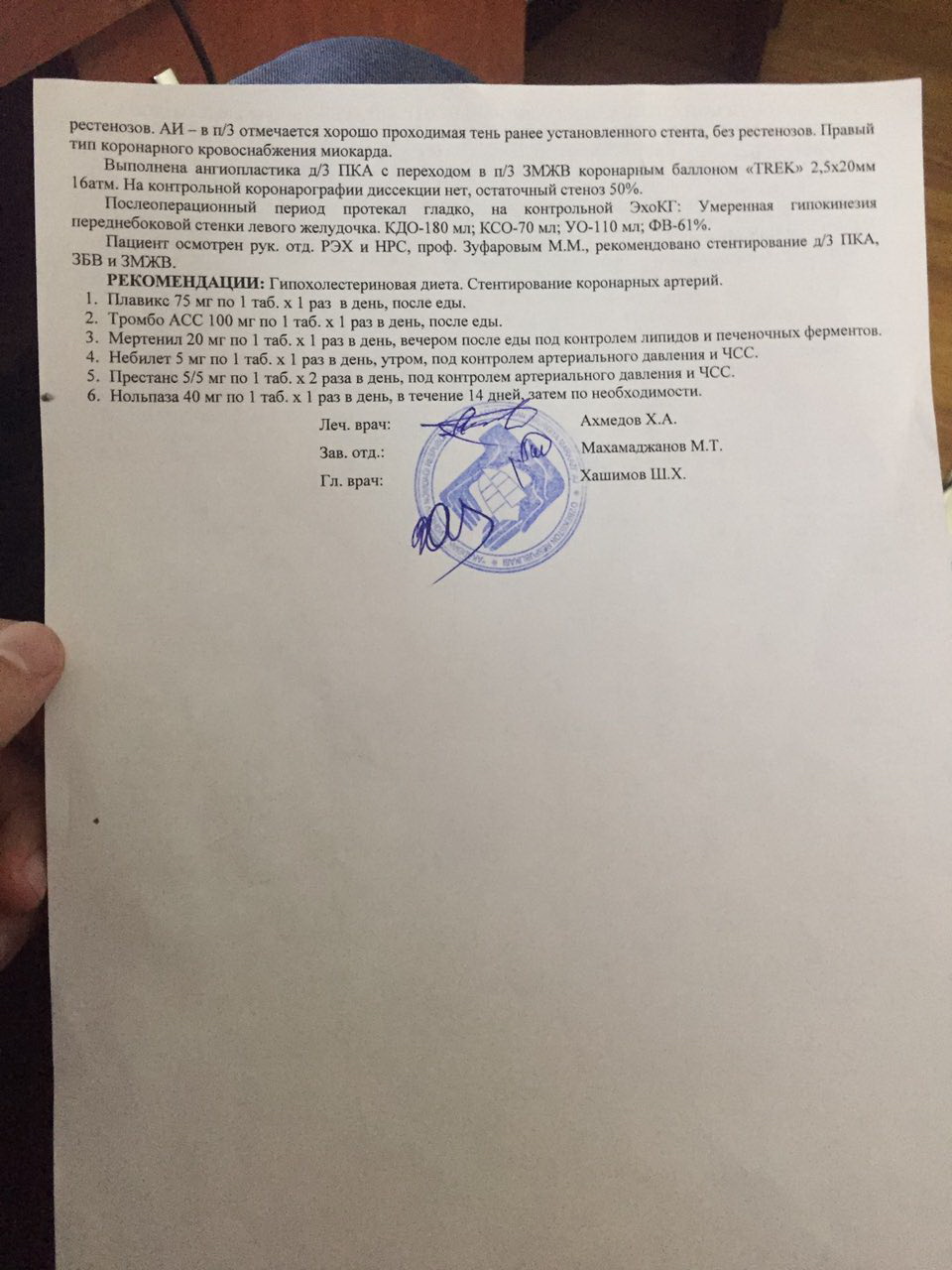 Здравствуйте, меня зовут Зумрад и я живу в городе Ташкент. Недавно моему брату сделали операцию по стентированию коронарных сосудов.Поставили 2 стента, а третий стент из-за маленького размера не смогли и посоветовали ехать в Москву. Подскажите пожалуйста в какую мед.учреждению могу обратиться. Очень ждем Вашей рекомендации, спасибо большое заранее. Диск я прикрепляю и есть еще Выписка из истории болезни.Если нужно пришлю.