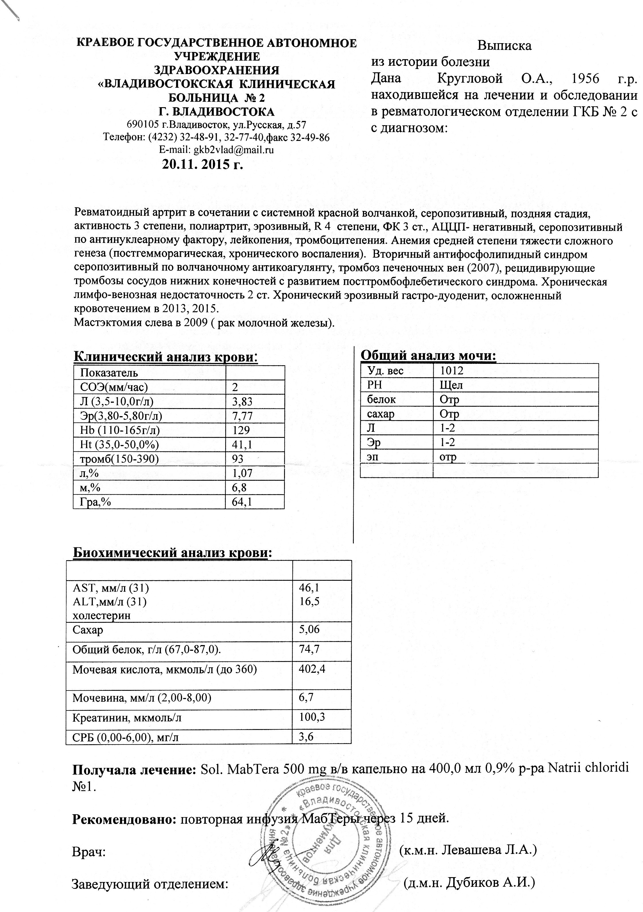 Здравствуйте друзья. Я очень рада, что хоть появилась возможность с кем то посоветоваться. Мне 61 год, из них 23 года как я болею ревматоидным артритом. Сейчас я на преднизалоне (1 таб. в день). Почти всю жизнь прожила во Владивостоке, сейчас больше года , как переехала в Краснодар. Я загрузила свою выписку из больницы. Сколько добавилось проблем за эти годы. Во Владивостоке я сделала 2 капельницы с Мабтерой. Сейчас пока на очередь не поставили. Я не знаю, что мне делать.Подскажите, помогите.Я очень устала от постоянной боли.