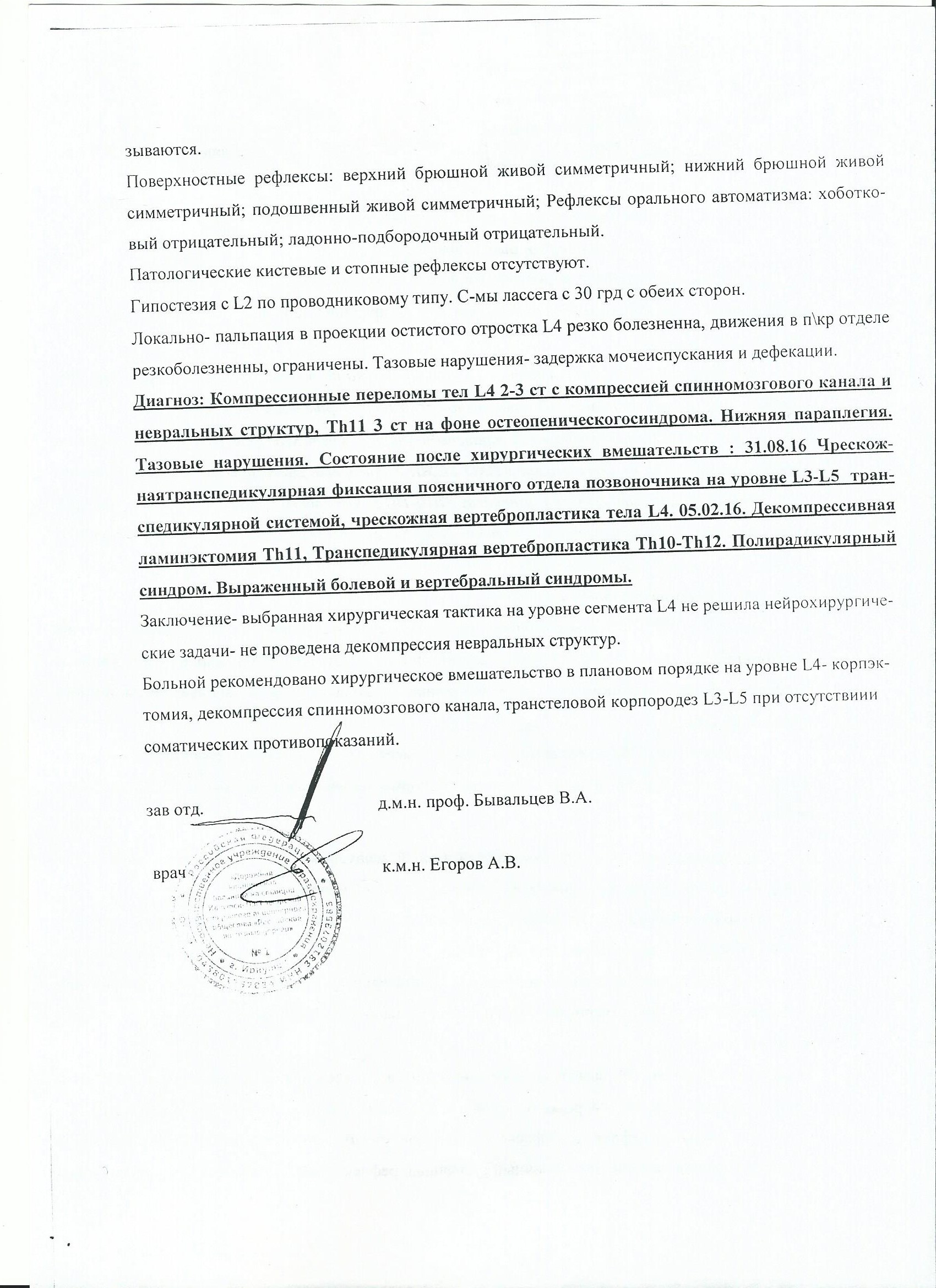 Здравствуйте! Прошу Вас рассмотреть результаты проведённого лечения и обследования. 30.11.2016 проведена остеоденситометрия проксимального отдела правого и левого тазобедренного сустава. В настоящее время данных ОДМ за остеопенический синдром и остеопороз нет. В течении года не установлена причина разрушения позвоночника. Травм не было. Однако уже проведено две операции - компрессионные переломы позвоночника. Что необходимо обследовать для установления причины разрушения позвоночника. Где можно установить причины разрушения позвоночника и проведение операции (декомпрессия спинномозгового канала на уровне L4)? В виду того, что не удалось прикрепить второй лист заключения осмотра - продолжение во втором письме. С уважением Гладких Ю.Г.