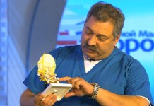 Как вылечить травму руки? Халат врача надевает спортивный комментатор Виктор Гусев.