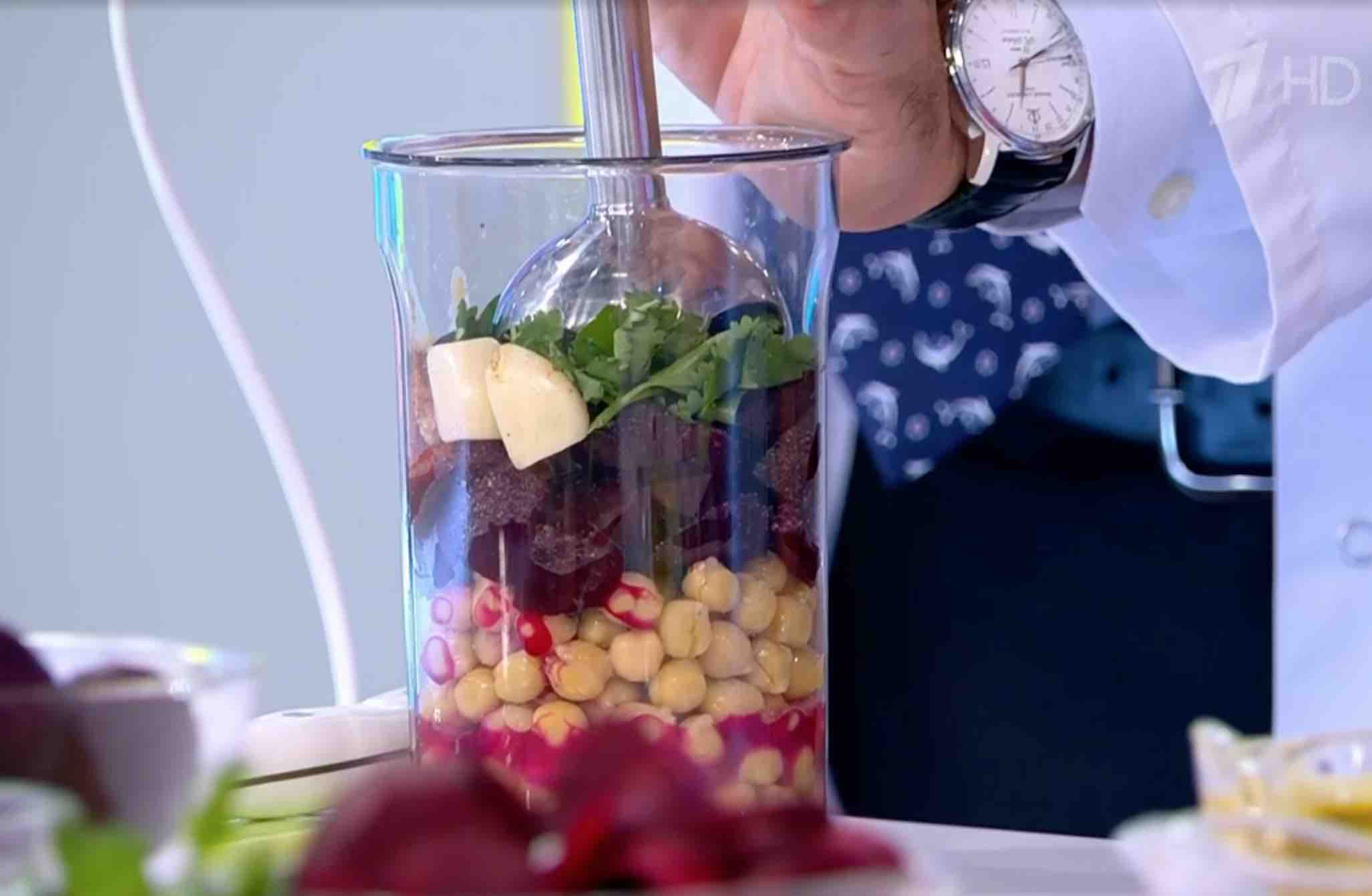 Свекольный хумус состоит из свёклы, хумуса, пасты тахини и специи по вкусу. Нут должен быть отварным или консервированным, к нему необходимо добавить отварную нарезанную свёклу и пасту тахини, смешать всё в одну массу с помощью блендера и добавить кедровые орехи.