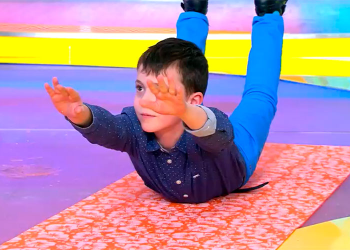 1) Лягте на живот, вытяните руки вперед, а затем начинайте руки и ноги тянуть вверх.